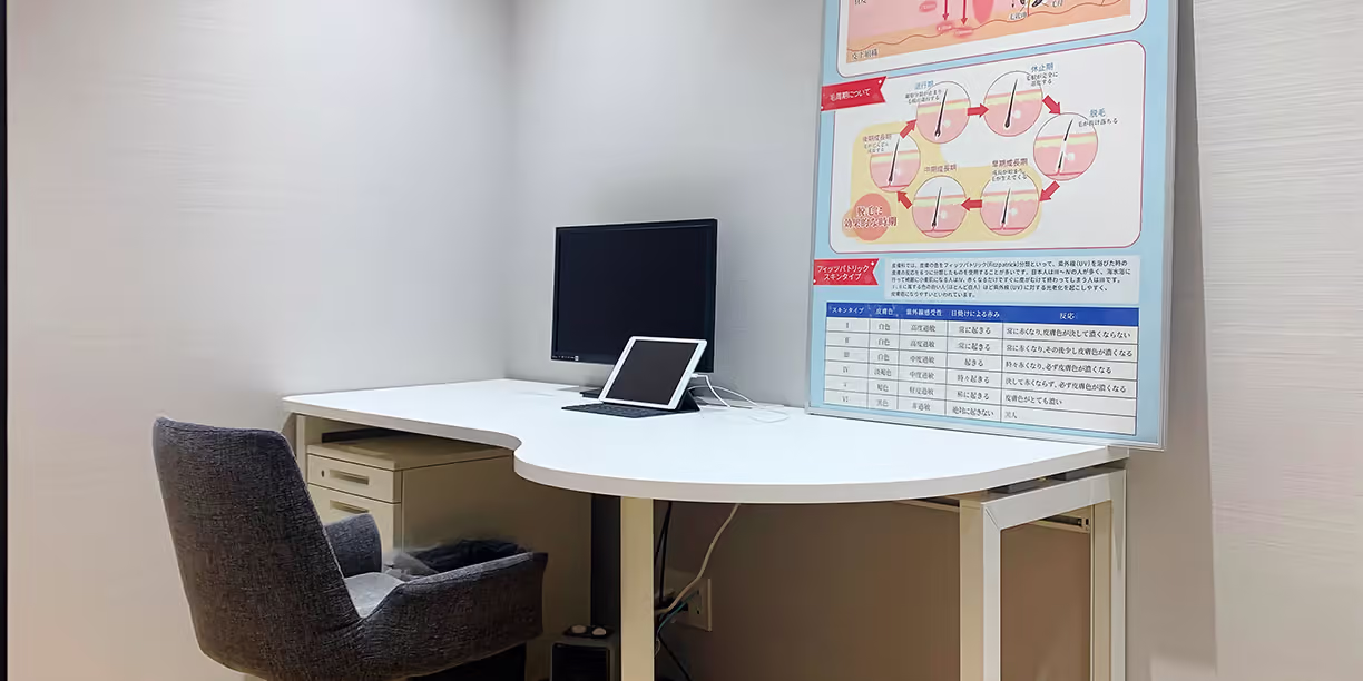カウンセリング専門のスタッフが、患者様の肌の悩みやご希望をお伺いします。ご希望の照射部位に応じたプラン・部位ごとのリスクなどを説明します。