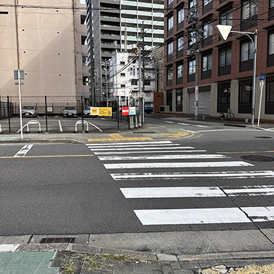 3.右手に駐車場(いずみパーキング名駅第3)が見えたら、その先の横断歩道を渡ります。 -