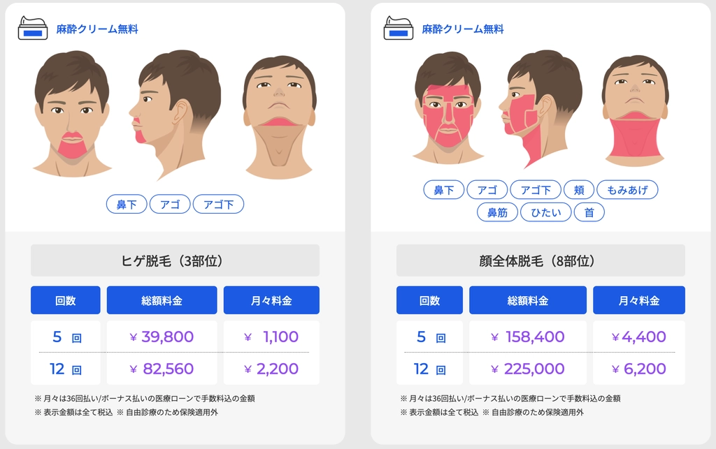 初めての方でも安心してヒゲ脱毛を始められるように、レジーナクリニックオムでは「ヒゲ脱毛デビュープラン」を提供しています。このプランでは、鼻下・アゴ・アゴ下の3部位を対象に、3回の施術が一括9,900円(税込)で受けることができます。以下のように、5回、12回など、回数を指定してプランを契約することも可能です。