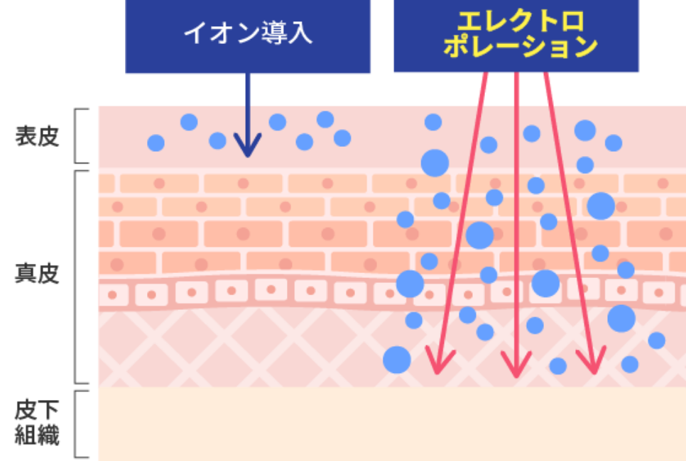 スキンケアやイオン導入比べて圧倒的な浸透力を持つエレクトロポレーション。大きな分子量の成分でも効率的に肌の奥へ届けることが可能です。