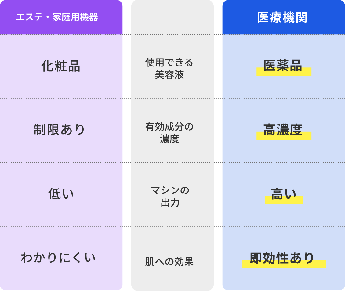医療機関ならではの高い施術効果効果と安全性を兼ね備えた医療機関でしか使用が許されない薬剤を使用。エステやご家庭向けのエレクトロポレーションでは美容効果を実感できなかった方にもおすすめします。